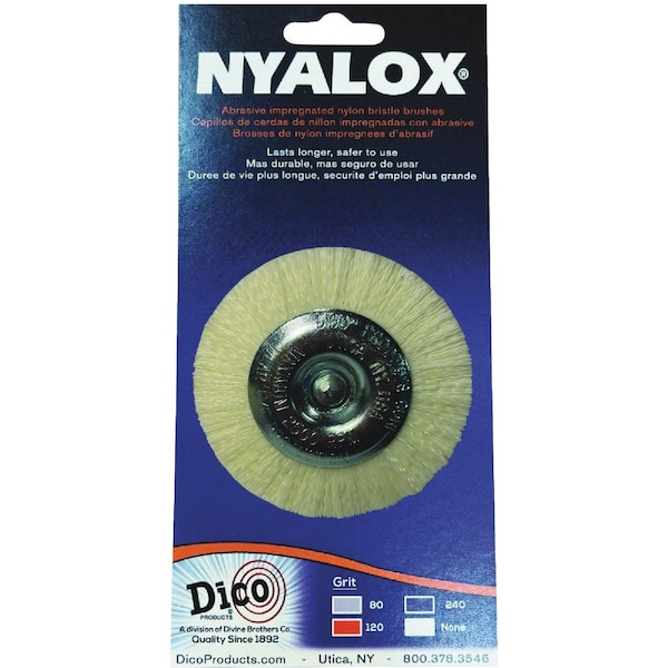 Nyalox White End Brush Nylon Non-Abrasive and Mandrel Mounted Use as a Power Wheel Brush for General Purpose Cleaning without Abrasive Material and 0 Grit. Superior to Wire Brushes and lasts up to 10 times longer. Will not rust shed or puncture skin. Use on metals wood and much more.
