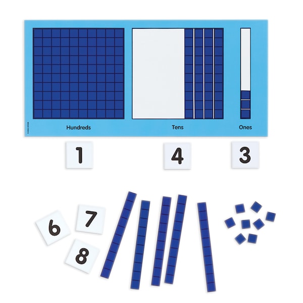 Model essential base ten and place value concepts for the whole class or for small groups with this clever tool. Works on any magnetic surface and consists of frame, base ten pieces, 21 number labels, and extensive teaching notes related to math standards. Frame measures 18" wide by 9" high. Base ten cubes are 0.625". Includes 20 unit cubes, 20 ten rods, and 1 hundred flat. This is a large magnetic version of our Base Ten Place Value Frame. Grade K-2.
