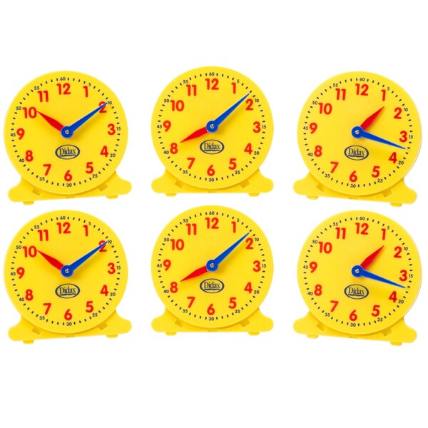 The hands of the 12-Hour Student Clock move together on a gear to maintain accurate hour and minute relationships. Ideal for teaching young students the concept of telling time. Measures 5" diameter. Durable plastic. Each set includes 6 clocks.