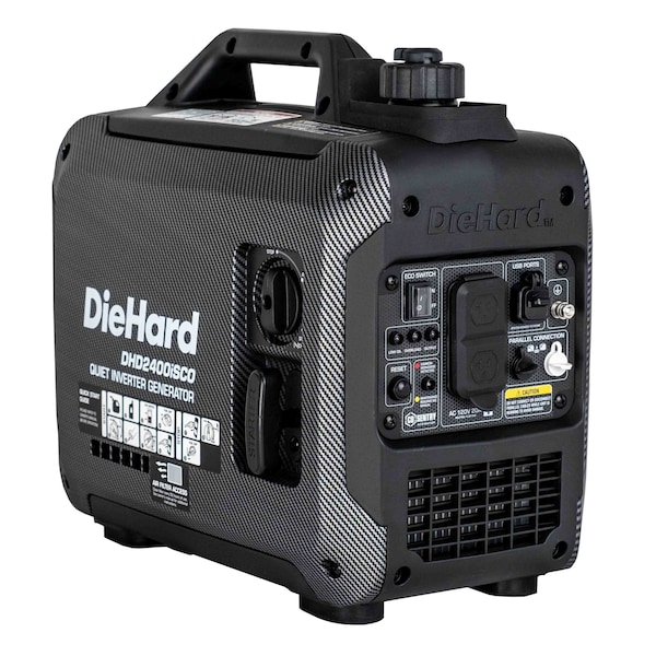 The DieHard 2400 Watt Inverter Generator is the perfect combination of power, portability, and safety. It's designed for anyone who needs reliable energy for recreational activities or unexpected emergencies. Whether you're camping in the great outdoors or looking for emergency power at home, this gasoline-powered generator delivers the performance you need while remaining easy to use. With its built-in inverter system, the DieHard DHD2400iSCO generator provides clean and stable power, making it safe for sensitive electronics like laptops and smartphones. Its durable carbon fiber shell is impact-resistant, ensuring it can handle everyday use while looking great. Powered by a robust 80cc OHV engine, the generator offers a peak wattage of 2400W and a rated wattage of 2000W, allowing you to power your essential devices. It features two standard 120V outlets, along with USB-A and USB-C ports for versatile connectivity. Weighing only 34 pounds, this lightweight generator is easy to carry, making it ideal for job sites, home emergencies, or recreational alike.