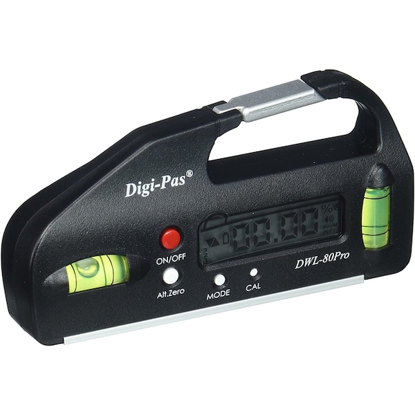 DigiPas DWL80EPRO is an aesthetic innovative pocketsize digital level having a HIGHER resolution of 005 deg Alternate Zero feature Builtin with a magnet base, DWL80PRO can easily attach to metal surfaces HOLD function freezes display reading on difficult reaching work environment This unit has long battery life and a 3 minutes AUTO shut off feature to conserve battery For over a decade, DigiPas is a worldleading digital level manufacturer with a full range of digital levels of varying precision and performance features for industrial, scientific, trade professionals and DYI users Granted with numerous USPTO patents, DigiPas Level utilizes advanced MEMS technology, proven to effectively replace oldfashioned spirit vial levels Its premium models of highprecision intelligent levelling instruments have been widely used by some of the world's most technologically advanced companies, research laboratories and government institutions all over the worldKEY FEATURES1 DUAL FUNCTIONS tiltangle gauge to set and also check relative angles between two surfaces using Alternate Zero function 2 PRECISION EASY RECALIBRATION by user back to factory setting with no special fixture3 RESOLUTION 005 deg 0 deg 90 deg, 02 deg other angles, switchable display between deg, slope , mmM, inchFT 4 STRONG MAGNETIC BASE securely attach to fences, saw blade base, and other metallic surfaces 5 SMART TECHNOLOGY SENSOR improve accuracy with precise displays in degrees, InFt, mmM, slope Auto invert display when gauge is upside down 6 MEASURING RANGE 0 deg 90 deg x 4 360 deg with full temperature compensation ensuring accuracy of measurements within 32 degF to 122 degFSPECIFICATIONS1 Measuring range from 0 deg 90 deg 4 x 90 deg 360 deg 2 Resolution of 005 deg, 10mmM 3 Accuracy of 005 deg at around 0 deg 90 deg 02 deg at 1 deg89 deg 4 Alternate Zero feature 5 Digital display of angle in degDegree, slope, mmM inFt 6 Autoreverse reading of LCD display 7 Build in magnet at the base of aluminium 8 5 Minutes auto off