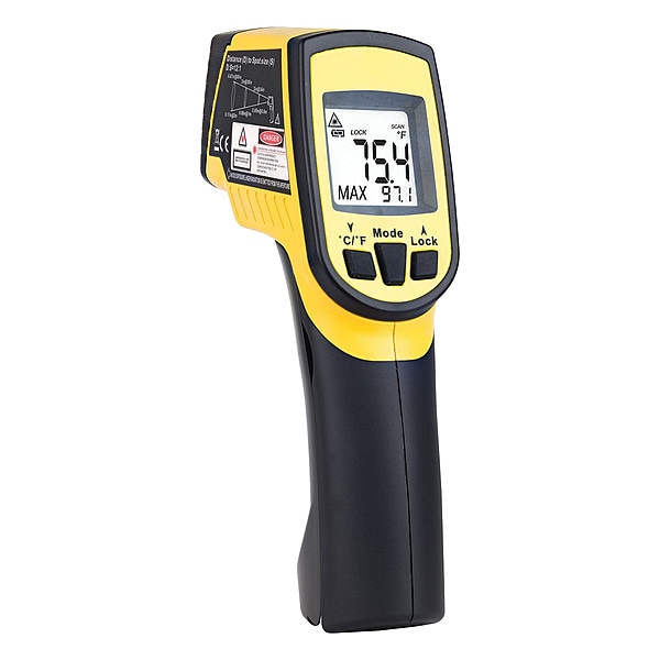 Infrared Thermometer, Laser Sighting Type Circular, Secondary Measuring Method Probe, Emissivity Adjustability Adjustable, Distance To Spot Ratio 12:1, Alert Type Sound, Minimum Emissivity Setting 0.10, Maximum Emissivity Setting 1.00, Minimum Temperature Measured Degrees F -76 Degrees F, Maximum Temperature Measured Degrees F 1,022 Degrees F, Minimum Operating Temperature Degrees F -76 Degrees F, Maximum Operating Temperature Degrees F 1,022 Degrees F, Body Style Full Size
