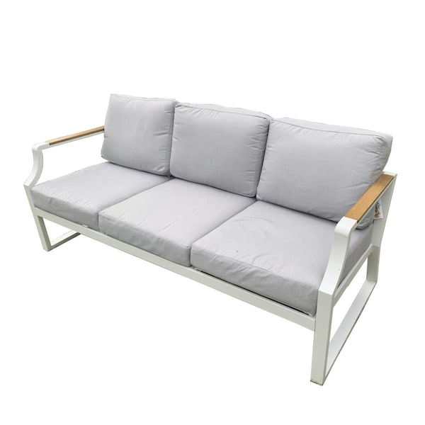 1 Piece Outdoor Garden White Iron Three-seat Sofa with Grey Cushions