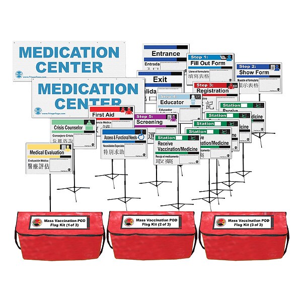 Mass Vaccination POD Flag and Banner Kit, Length 32 in, Width 17 1/2 in, Height 16 in, Includes (16) 24 in x 16 in Double-Sided Flags, (16) 82 in Maximum Height Telescopic Poles, (16) Fold-Up Tripod Bases, (2) 96 in x 30 in Medication Center Banners, (3) Durable Carry Bags