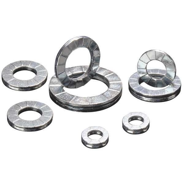 Lock Washer, Wedge, Carbon Steel, Finish Zinc, Fits Bolt Sizes 5mm, 5mm, Inside Dia. 5.15mm, Outside Dia. 10.18mm, Thickness 2.03mm, Color Silver, Rockwell Hardness HRC 40-55 Case Hardened, General Purpose, For Use With Bolts, Package Quantity 200