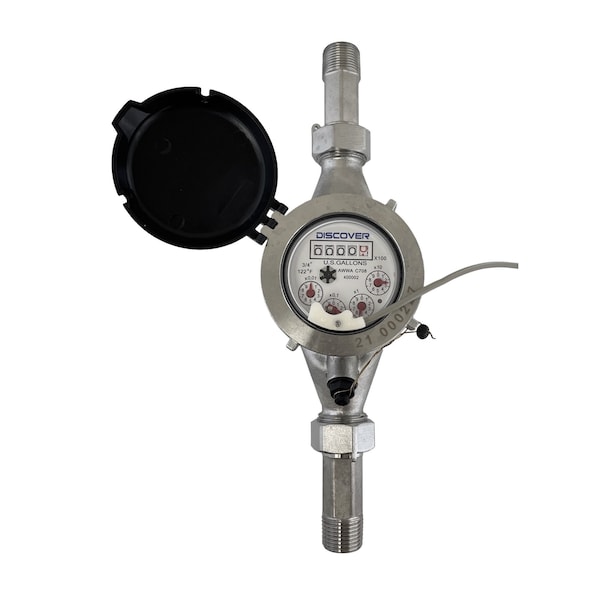 3/4 in. x 3/4 in. Horizontal multi-jet water meter measures in Gallons. 3/4 in. Lead-free 304 stainless steel water meter. Includes factory installed dry contact reed switch, and a pair of 3/4 in. 304 stainless steel NPT water meter couplings. Corrosion and rust resistant 304 stainless steel body meets NSF requirements for lead free use in potable water, rated at 150 PSI maximum working pressure, 15GPM continuous flow. Every meter flow tested and serialized, factory certified test results included with every meter. Meets AWWA C708 standards.