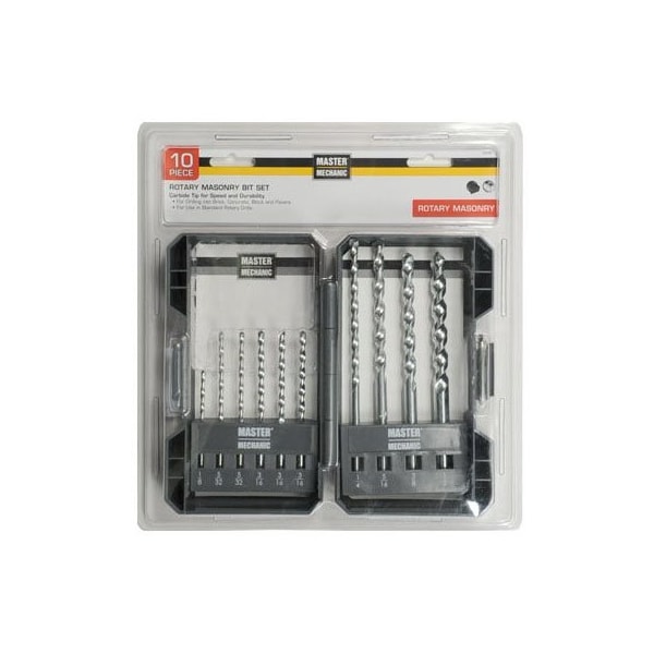 Master Mechanic, 10 Piece, Rotary Masonry Drill Bit Set, Carbide Tip Geometry For Speed Durability, For Use On Standard Drills, Includes 3 18,3 316, 2 14, 1 38 1 12, Organized In Durable Case, Clamshell