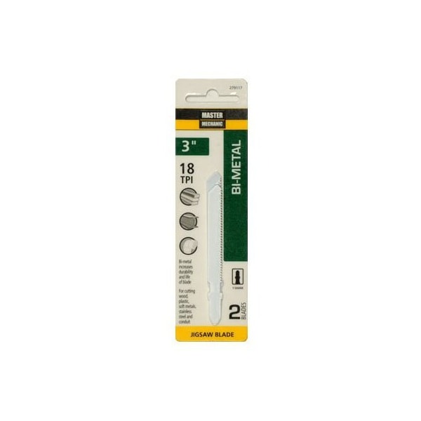 Master Mechanic, 2 Pack, 3 x 18 Tooth, BiMetal, Bosch T Shank Style, Jig Saw Blade, Milled Set Teeth For Maximum Performance, BiMetal With Cobalt Content Matrix II Cutting Edge Greatly Reduces Heat Water Resistance When Cutting In Wood Metal Applications, Designed To Cut Hard Or Soft Wood, Plastic, Soft Metals, Stainless Steel Conduit, Carded