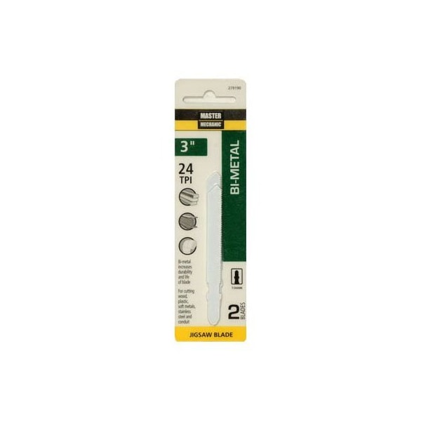 Master Mechanic, 2 Pack, 3 x 24 Tooth, BiMetal, Bosch T Shank Style, Jig Saw Blade, Milled Set Teeth For Maximum Performance, BiMetal With Cobalt Content Matrix II Cutting Edge Greatly Reduces Heat Water Resistance When Cutting In Wood Metal Applications, Designed To Cut Hard Or Soft Wood, Plastic, Soft Metals, Stainless Steel Conduit, Carded