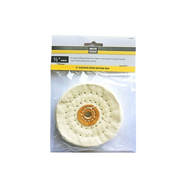 Master Mechanic, 4 Cushion Sewn Buffing Pad, Made From 40 Plies Of Full Disc, Tightly Woven, Industrial Cotton Sheeting, For Regular Buffing Operations To Cut Down Or Color Metals To A Bright Final Finish, Ready To Use, PreRaked Face Ready To Mount On A SpindleShaft, Use TV 842917 Adaptor To Mount On a Drill