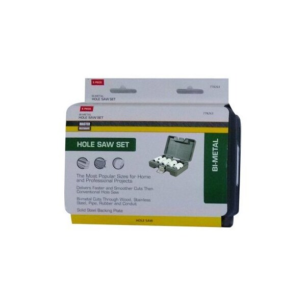 Master Mechanic, 6 Piece, BiMetal, Hole Saw Set, High Speed Steel Cutting Edge, 112 Depth Of Cut Provides Easy Cutting In The Toughest Applications Designed To Cut Hard Soft Wood, Nail Embedded Wood, Stainless Steel, Pipe, Rubber Conduit, Set Includes Hole Saw Sizes 112, 114, 118, 1 78, Mandrel Hard Plastic Storage Case, Carded