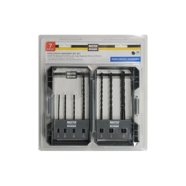 Master Mechanic, 7 Piece, Rotary Percussion, Masonry, Drill Bit Set, Black Oxide, Carbide Tipped Designed For Use In Drills With Rotary Or Hammer Mode, Recommended For Drilling Cinder Block, Common Hard Brick, Plaster, Ceramic Tile, Glazed Tile Wet Or Dry Concrete For Moderate Use In Marble, Granite Concrete Over 6000 PSI, Includes 18, 2532, 2316, 14 38, Organized In A Durable Case, Clamshell