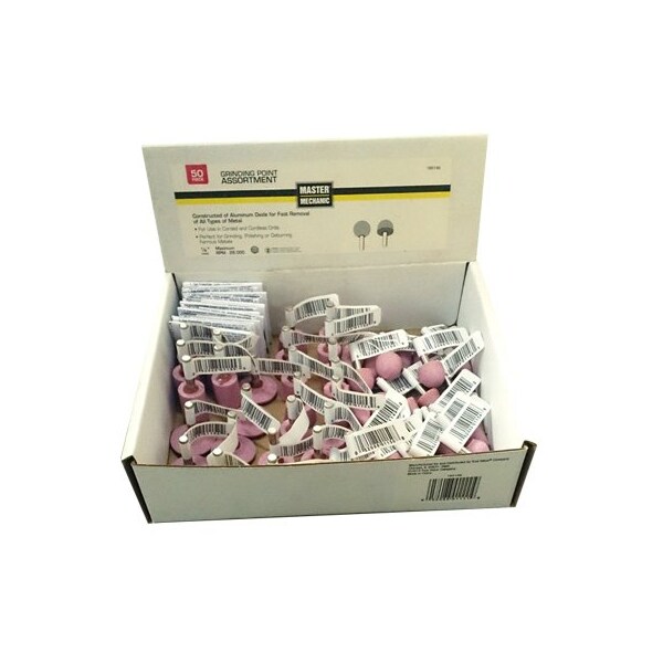 Master Mechanic, Grinding Point Assortment, Contains An Assortment Of 10 Different Styles Of Grinding Points, 14 Shank Fits Die Grinders Drills, Use For Grinding Shaping All Types Of Metals, Includes 5 Each Of Following Style A5, 34D x 118L, Cone Shaped, Style A12, 1116D x 114L, Cone Shaped, Style A14, 1116D x 78L, Cone Shaped, Style A22, 34D x 58L, Half Round Shaped, Style A32, 1D x 58L, Cone Shaped, Style A37, 114D x 14L, Cup Shaped, Style A39, 34D x 34L, Cylinder Shaped, Style A40, 34D x 34L, Round Shaped, Style W206, 34D x 114L, Cylinder Shaped Style W217, 1D x 38L, Wheel Shaped