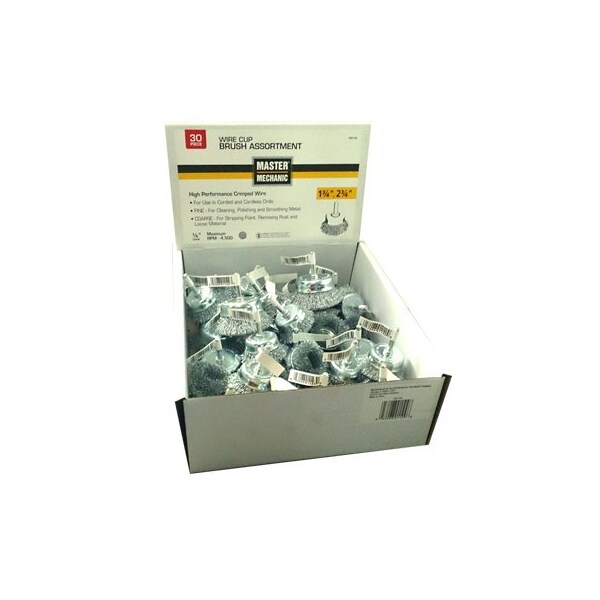 Master Mechanic, Wire Cup Brush Assortment, Consists 6 Each Of 134 Crimped Fine Wire Cup Brush With 14 Stem, 12 Each Of 134 Crimped Coarse Wire Cup Brush With 14 Stem, 4 Each Of 234 Crimped Fine Wire Cup Brush With 14 Stem, 8 Each Of 234' Crimped Coarse Wire Cup Brush With 14 Stem, Comes In A POP Display Box That Can Be Merchandised On The Counter Or On The Base Shelf
