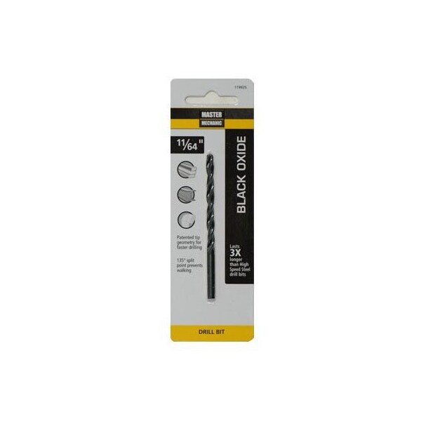 Master Mechanic, 1164 x 314, High Speed Steel, Black Oxide Drill Bit, 135 Split Point, Jobber Length, Straight Shank, 135 Point Angle With 4 Cutting Edges Which Eliminate Walking Provide Fast Penetration, Black Oxide Tempering Treatment Reduces Frictional Resistance Improves Chip Flow, Recommended For Wood, Plastic, Wallboard, Plywood Soft Metals, Aluminum, Brass Bronze, For Occasional Use In Stainless Steel Other Hard Metals, Carded