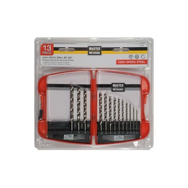Master Mechanic, 13 Piece, High Speed Steel, Drill Bit Set, Contains 116, 564, 332, 764, 18, 964, 532, 1164, 316, 1364, 732, 1564, 14, 118 Point, Bright Silver Finish, Steel Shank, Jobber Length, Features 2 Cutting Edges Polished Flutes, Recommended For Drilling Wood, Plastic, Wallboard Plywood, For Moderate Use In Soft Metal, Brass, Bronze, Sheet Metal Aluminum, Plastic Storage Case With Hang Tab