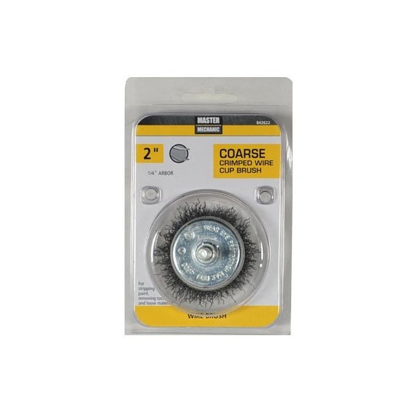 Master Mechanic, 2, Coarse, Utility Crimped Wire Cup Brush, 14 Shank, For Use On Electrical Tools As Well As Drill Presses, 4,500 RPM Maximum Speed, 012 Wire Gauge, For Stripping Paint, Removing Rust Loose Material