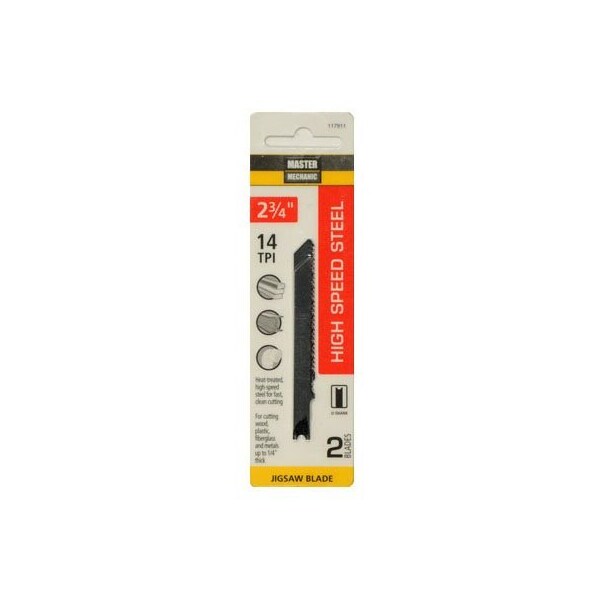 Master Mechanic, 2 Pack, 234 x 14 Tooth, Metal Cutting, High Speed Steel, Jig Saw Blade, 14 Universal Shank, Designed To Cut Through Wood, Plastic, Fiberglass Metals Up To 14 Thick, Carded