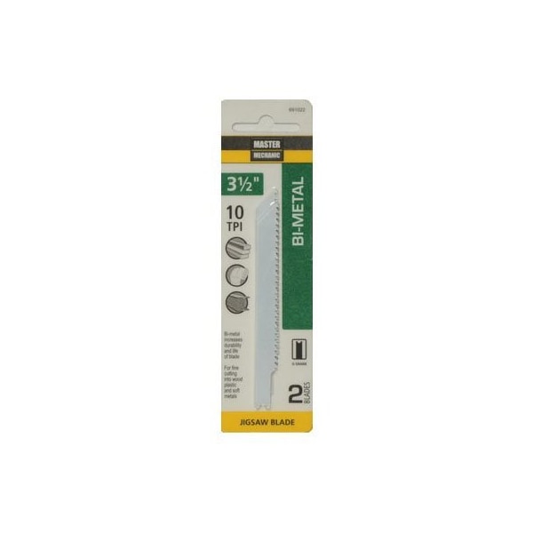 Master Mechanic, 2 Pack, 312 x 10 Tooth, BiMetal, Jig Saw Blade, 14 Universal Shank, Wood, Cobalt Content Matrix II Cutting Edge Greatly Reduces Heat Wear Resistance When Cutting In Wood Metal Applications, Designed To Cut Stainless Steel, Wood, Pipe Conduit, Carded