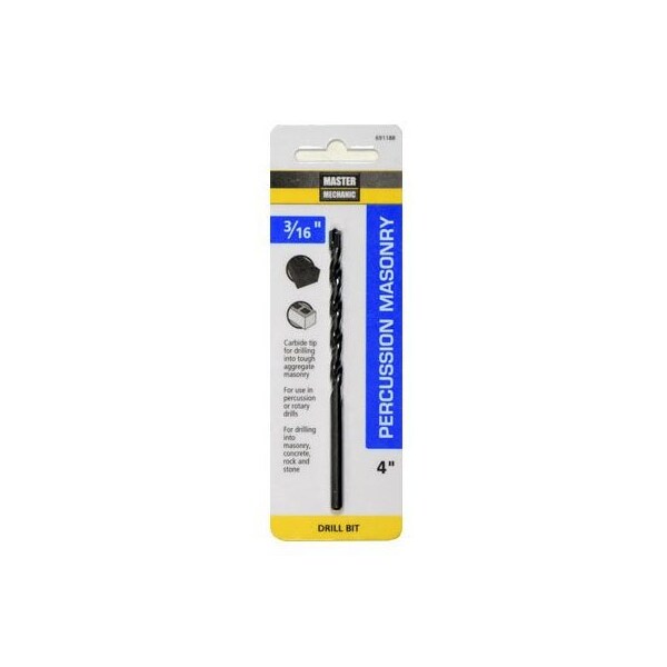 Master Mechanic, 316 x 4, Rotary Percussion, Masonry Drill Bit, Black Oxide, Carbide Tipped, Designed For Use In Drills With Rotary Or Hammer Mode, Recommended For Drilling Cinder Block, Common Hard Brick, Plaster, Ceramic Tile, Glazed Tile Wet Or Dry Concrete For Moderate Use In Marble, Granite Concrete Over 6000 PSI, Carded