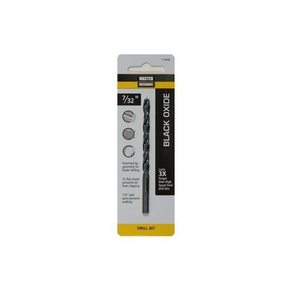 Master Mechanic, 732 x 334, High Speed Steel, Black Oxide Drill Bit, 135 Split Point, Jobber Length, Straight Shank, 135 Point Angle With 4 Cutting Edges Which Eliminate Walking Provide Fast Penetration, Black Oxide Tempering Treatment Reduces Frictional Resistance Improves Chip Flow, Recommended For Wood, Plastic, Wallboard, Plywood Soft Metals, Aluminum, Brass Bronze, For Occasional Use In Stainless Steel Other Hard Metals, Carded