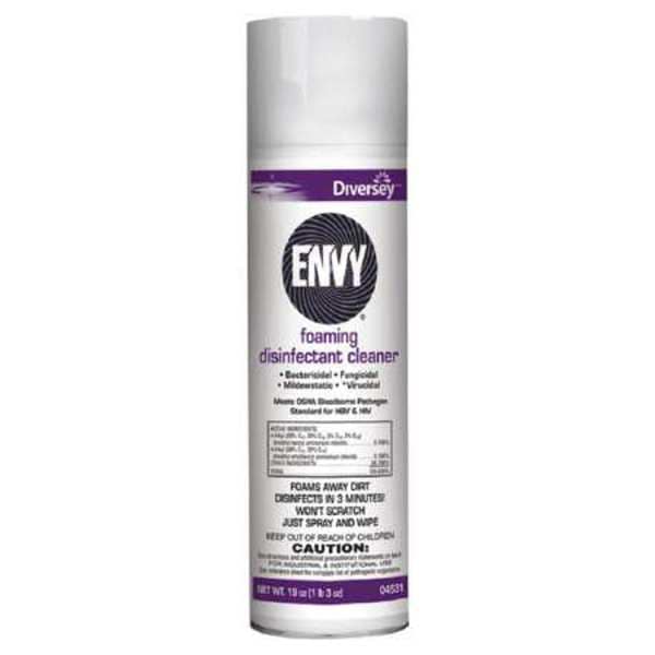 Disinfectant Cleaner, Primary Chemical Quat, Container Type Aerosol Spray Can, Container Size 19 oz, Ready to Use/Concentrated Ready to Use, Recommended Dilution Ready to Use, Fragrance Lavender, Cleaner Form Foam, Surfaces for Use On Hard Non-Porous, Standards EPA Registered, Wet Contact Time 3 min, Product Series Envy(R), VOC Content 7 Percent, Flash Point 7 Degrees F, Rinse Required Yes, NSF Rating Not Rated, EPA Registered Yes, EPA Registration Number 70627-35, Net Weight 19 oz
