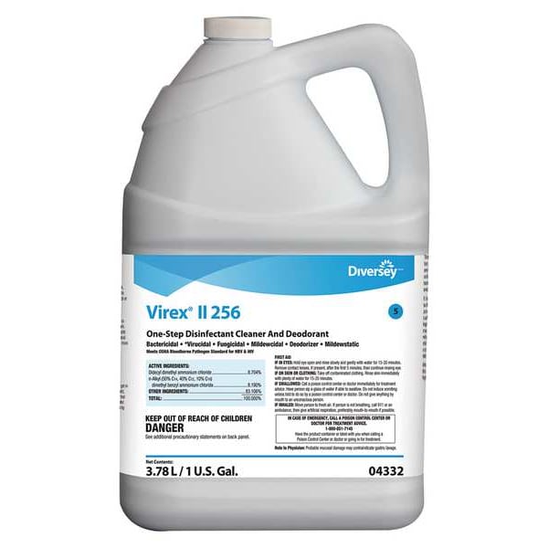 Deodorizing Disinfectant Cleaner, Primary Chemical Quat, Container Type Jug, Container Size 1 gal, Ready to Use/Concentrated Concentrated, Recommended Dilution 1:256, Fragrance Mint, Cleaner Form Liquid, Surfaces for Use On Hard Non-Porous, Standards EPA Registered, FDA Approved, Wet Contact Time 5 to 10 min, Targeted Pathogens C. Difficile Spores, Hepatitis A, Hepatitis B, Herpes Simplex Virus (Type I), HIV-1, Influenza A, MRSA, Product Series Virex II 256, VOC Content 3 Percent