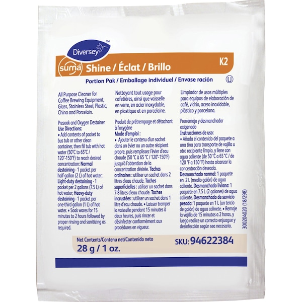 Suma Shine Portion Pak is an oxygen-based, powdered presoak and de-stainer for plastic cups, plates, flatware, utensils, glass coffee pots, coffee urns and tea urns. This alkaline detergent is specially formulated for removal of coffee, tea, cocoa and milk stains. It is effective in removing coffee and tea stains because of active oxygen and removing cocoa and milk stains by alkali source. Suma Shine prevents scaling in hard water conditions when used as directed. This white powder has no fragrance added.