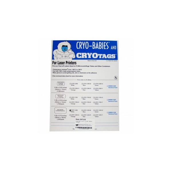Convenient Cryo-Tags offer superior temperature and chemical resistance. Durable labels withstand cryogenic liquid nitrogen storage, boiling water baths, solvents, caustic solutions and other laboratory chemicals. Cryo-Tags fit bottles, flasks, vials, cryoboxes and more. Chemically inert poly vinyl labels adhere to all polypropylene and polyethylene surfaces without cracking, peeling or degrading and can be marked with a regular pen or marker. Laser Tags are available 60 labels per sheet, 20 sheets per package.