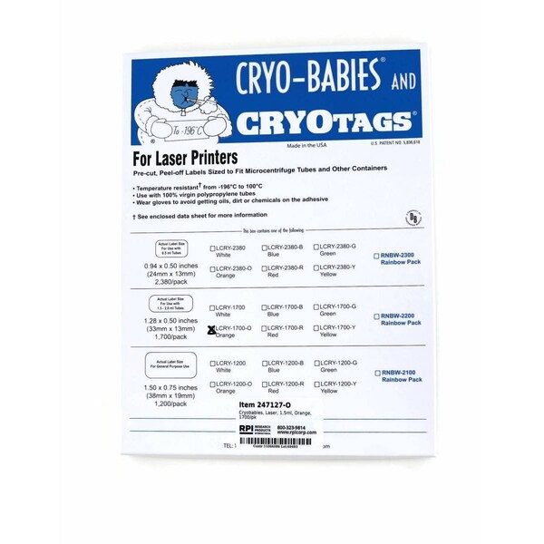 Cryo-Babies are designed to offer superior temperature and chemical resistance. Durable labels withstand cryogenic liquid nitrogen storage, boiling water baths, organic solvents, caustic agents and other laboratory chemicals. Cryo-Babies fit cryogenic vials and 1.5 - 2.0 ml micro-tubes. Chemically inert poly vinyl labels adhere to all polypropylene and polyethylene surfaces without cracking, peeling or degrading and accept any marking instrument.