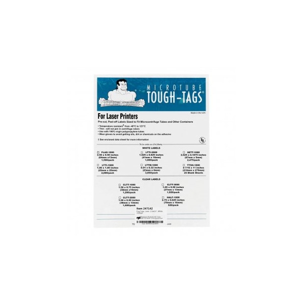 Flag-Tags extra long labels provide extra space for coding micro-tubes. Polyester labels are chemically inert and have strong adhesion properties. Adhere to all plastics and withstand steam autoclaving, boiling water baths, freezer temperatures, organic solvents, and caustic agents. Laser sheets are supplied in 3 x 20 array, 25 sheets per package, white color.