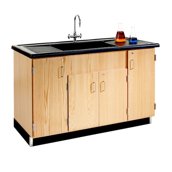 Each Outer Cabinet Has Adjustable Shelf and Cabinets Have Locking Doors, Chemical Resistant, Earth-Friendly UV Finish, Unit Includes a Hot and Cold Water Mixing Faucet