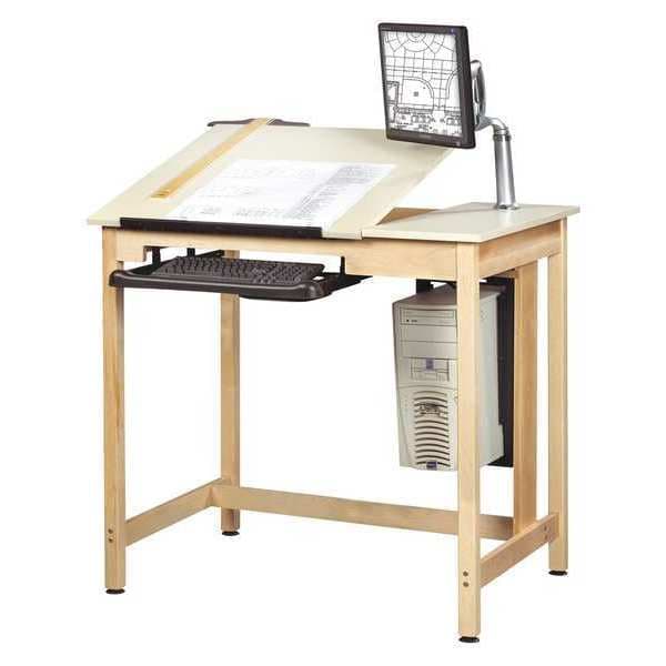 Drafting Table, Tabletop Color Almond, Tabletop Material Laminate, Tabletop Thickness 3/4 in, Frame Material Wood, Frame Color Maple, Frame Finish Natural, Overall Depth 30 in, Overall Width 42 in, Adjustable Height Yes, Maximum Height 39 3/4 in, Minimum Height 39 3/4 in, Number of Tilting Surfaces 1, Maximum Tilt Angle 30 Degrees , Assembly Unassembled, Minimum Tilt Angle 0 Degrees , Caster/Glide Type Leveling Glides, Includes Document Rail Yes, Includes Footrest No, Includes Keyboard Tray Yes