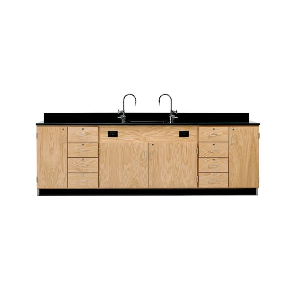 - Outer ends offer a locking cabinet with one full height door that includes one adjustable shelf and four locking drawers plus 2 GFI protected AC duplex receptacles