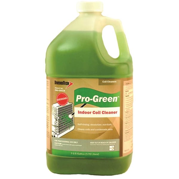Features: Cleans deposits from the evaporator coil, Deodorizes, Rids condensate pans of slime, Self rinsing, Safe Benefits: Leaves the coil free and clean of potential indoor contaminants. Leaves the indoor coil smelling fresh and clean. Prevents buildup and pan overflow, Spray it on and walk away. Uses system condensate to rinse the coil making it easy to use. Non toxic, non corrosive, and non fuming. Application: Pro-Green Indoor Coil Cleaner is a mildly alkaline cleaner, containing no free caustic, that is formulated for evaporator coils or anywhere complete but non-corrosive cleaning is required. Pro-Green is safe on aluminum and non-fuming to help ensure no odors get drawn into the building. Pro-Green is the perfect blend of cleaning power without the concerns of applying harsh chemicals that may damage coils. MIX RATIO, 1:3 Mix 1 part Pro-Green with 3 parts water Directions: 1. For both indoor and outdoor use. Wear protective goggles and gloves. 2. For best results, mix one part Pro-Green with 3 parts water. 3. Shut system off, then spray the Pro-Green solution into the coil fins from bottom up. 4. Self rinsing with condensate. No rinsing is required for lightly soiled evaporator coils; however, condenser and extremely dirty evaporator coils will require rinsing. 5. Return the system to service. Pro-Green is also an excellent cleaner/degreaser for electrostatic and permanent filters, Must be purchased by the case, four 1 Gal.Pro-green cleans deposits on coils, rids condensate pans of slime and prevents buildup and pan overflowSafe for use on aluminum and is non-fuming to ensure no odors get drawn into the buildingPerfect blend of cleaning power without the concerns of applying harsh chemicals that may damage coilsLeaves the indoor coil smelling fresh and free of potential indoor contaminantsSpray it on and walk away, it conveniently uses system condensate to rinse the coilBiodegradable and NSF approved for use in federally inspected plantsPro-Green cleans deposits on coils, rids condensate pans of slime and prevents buildup and pan overflow