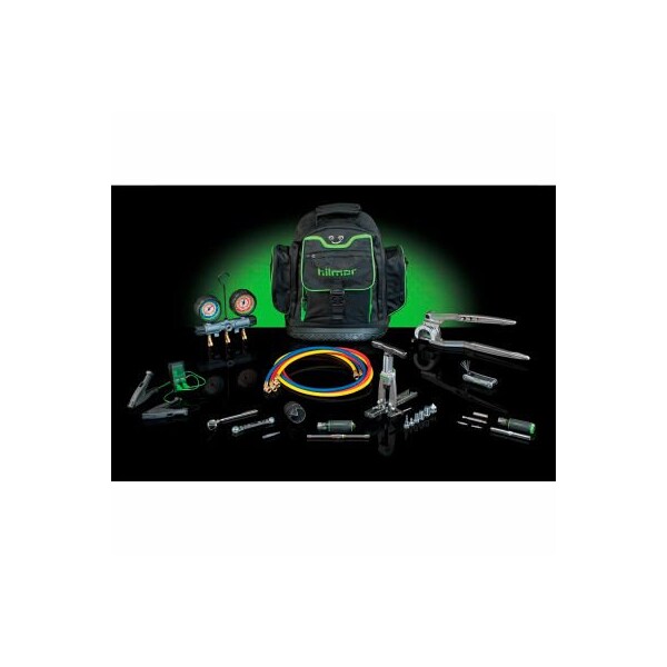 1890995 hilmor's hvac/r starter kit includes some of the most revolutionary new tools on the market. Tools to help you handle superheat and subcool with no sweat. Tools to help you flare and swage tubes without needing a third arm. All with the goal of helping you get in, get out and get on to the next job. Not to mention, get your foot in the door. Starter kit includes: dual readout thermometer, 2 valve aluminum manifold, 60" hose set, quick engage flare & swage, tri tube bender, service wrenches, deburrer, hex key folding kit, inspection mirror, quick change magnetic nut driver, 9 in 1 multitool, and backpack tool bag.