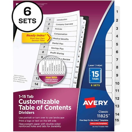 Cardinal OneStep Printable T.O.C. Divider, Printed 1, 15, 9"x11", 15 Tabs, White/Multicolor