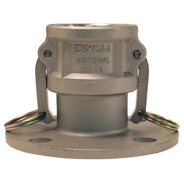Cam and Groove Coupling, Socket, Body Material 316 Stainless Steel, Type DL, Coupling Size 2 in, Connection Type Flange, Flange, Max. Working Pressure @ 70 F 250 psi, Socket Inside Diameter 2 in, Gasket Material Nitrile, Overall Length 4 3/64 in, Includes Locking Arm Yes