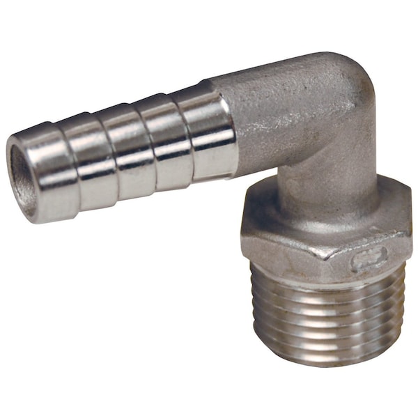 Barbed Hose Fitting, For Hose I.D. 1/2 in, Rigid, Fitting Shape 90 Degrees Elbow, Fitting Material 303 Stainless Steel x 303 Stainless Steel, Hex Head Size 3/4 in, Vacuum Rating Not Rated, Hex, Barb Size 1/2 in, Hose Fitting A Gender Male, Hose Fitting B Gender Male, Hose Fitting A Size 1/2 in, Hose Fitting B Size 3/8 in, Hose Fitting A Connection Type Hose Barb, Hose Fitting B Connection Type NPT, 303 Stainless Steel, Reusable Yes, No, Not Rated, Thread Size 3/8 in, Thread Type NPT