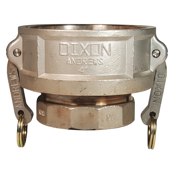 Cam and Groove Coupling, Socket, Body Material 316 Stainless Steel, Type D, Coupling Size 2 in, Female, Connection Type NPT, Hose Fitting Size 1 1/2 in, FNPT, Max. Working Pressure @ 70 F 250 psi, Socket Inside Diameter 2 in, Gasket Material Nitrile, Overall Length 3 7/32 in, Includes Locking Arm No, Thread Size 1-1/2 in -11-1/2