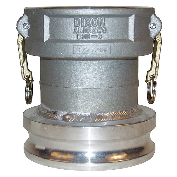 Cam and Groove Coupling, Socket x Plug, Body Material Aluminum, Type DA, Coupling Size 2 in Socket x 2 1/2 in Plug, Female Coupler x Male Adapter, Max. Working Pressure @ 70 F 150 psi, Plug Outside Dia. 3 in, Socket Inside Diameter 2 in, Gasket Material Nitrile, Overall Length 5 23/32 in, Includes Locking Arm No, Plug Length 1 15/16 in