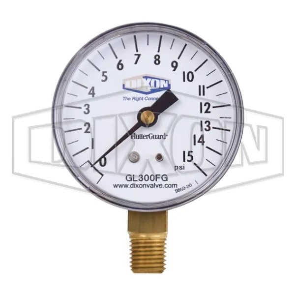 Dixon FlutterGuard GL300FG Dry Gauge, 0 to 15 psi, 1/4 in Connection, 2-1/2 in Dial, +/- 3-2-3 %