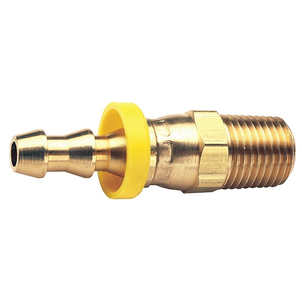 Push-On Hose Fitting, For Hose I.D. 3/8 in, Barb Size 3/8 in, Swivel, Fitting Shape Straight, Hex Head Size 11/16 in, Hose Fitting A Gender Male, Hose Fitting B Gender Male, Hose Fitting A Size 3/8 in, Hose Fitting B Size 3/8 in, Hose Fitting A Connection Type Hose Barb, Hose Fitting B Connection Type NPTF, Fitting Material Brass x Brass, C36000, Reusable No, 120 psi