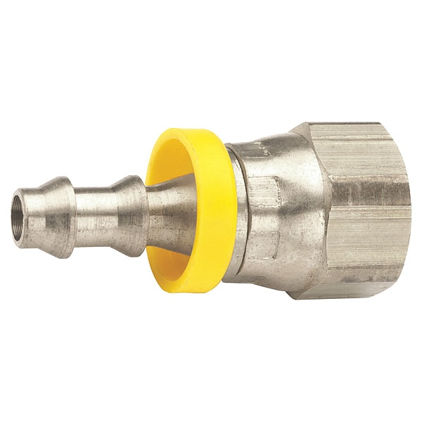 Push-On Hose Fitting, For Hose I.D. 3/8 in, Barb Size 3/8 in, Swivel, Fitting Shape Straight, Hex Head Size 11/16 in, Hose Fitting A Gender Male, Hose Fitting B Gender Female, Hose Fitting A Size 3/8 in, Hose Fitting B Size 3/8 in, Hose Fitting A Connection Type Hose Barb, Hose Fitting B Connection Type UNF, Fitting Material 303 Stainless Steel x 303 Stainless Steel, Reusable Yes, 350 psi