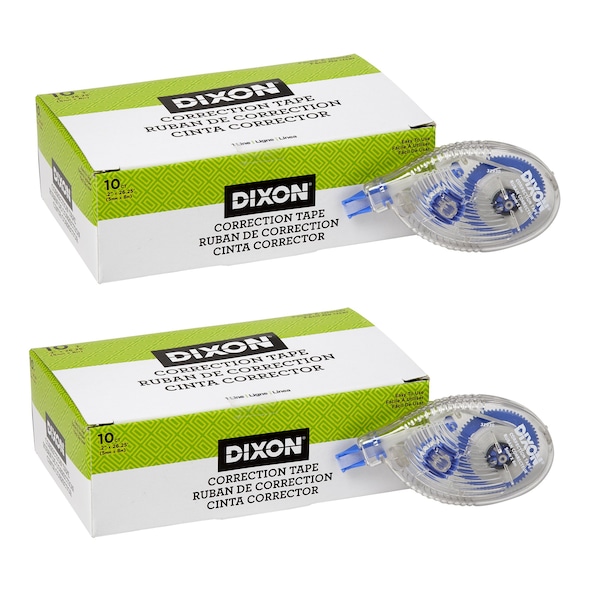 Dixon Correction Tape dispenser features a flexible tip for a smooth application and a contoured design for a comfortable hold. Application is fast with no drying time. Side application improves visibility. Dispenser contains .20" width x 26.2 ft. tape. Each pack includes 10 dispensers. Sold as 2 packs for a total of 20 dispensers.