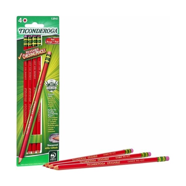 Dixon Ticonderoga Company Pencils,Erasable,w/Eraser,4/PK,Carmine Red Lead/Barrel PNCL,ERSBLE,RED,4CT