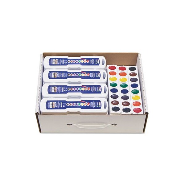 Semi-moist transparent watercolor paints contain no wax. Brilliant pigments mix cleanly, flow easily, and stay true. Paint never dries out. White, segmented lid for true color mixing. Master Pack: 24 Eight-Color Sets, 12 Eight-Color Refill Strips. Paint Sub-Category: Watercolor; Intended Application Environment: Interior; Finish/Sheen: Matte; Colors: Assorted.