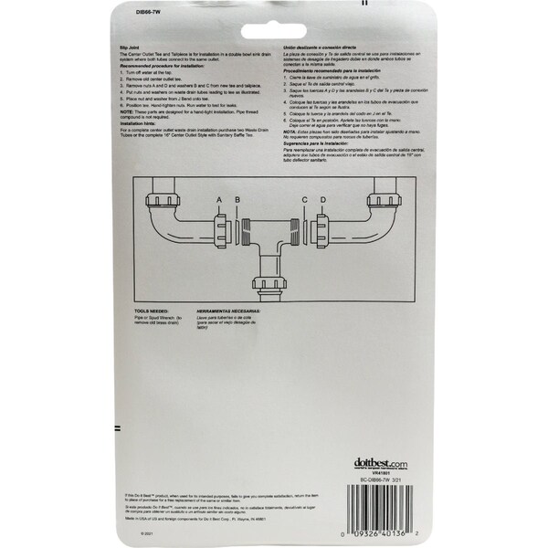 The Do it Best 1-1/2 In. White Polypropylene Center Outlet Tee allows you to join double bowl sink strainers to the drain connection. Featuring a Slip Joint Connection for easy installation the Center Outlet Tee includes all necessary nuts and washers for a strong connection that avoids leaks. Featuring a Baffle Tee design for optimal water flow the Center Outlet Tee is constructed of durable white polypropylene that is made to last.
