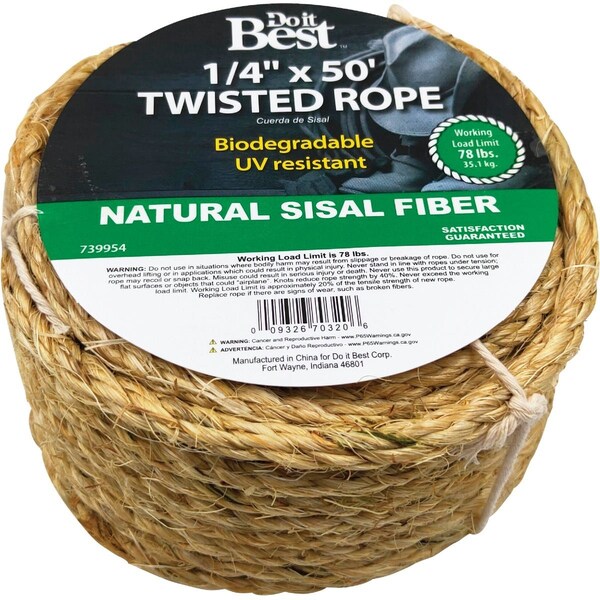 1/4'' x 50 Ft. Natural Twisted Sisal Fiber Packaged Rope