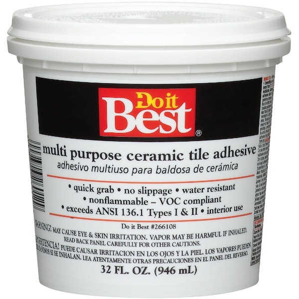 For installation of ceramic and mosaic tile on floors and walls. Spreads easily quick setting and is water-resistant. Meets specifications ANSI A136.1-1967 Type I. Do not use to apply lug-back tiles or to set ceramic fixtures. Fresh adhesive may be cleaned up with soap and water; dried adhesive may be removed with a razor blade. Coverage: Up to 75 Sq. Ft. per gallon on floors; up to 60 Sq. Ft. per gallon on walls. Color: Off-white.